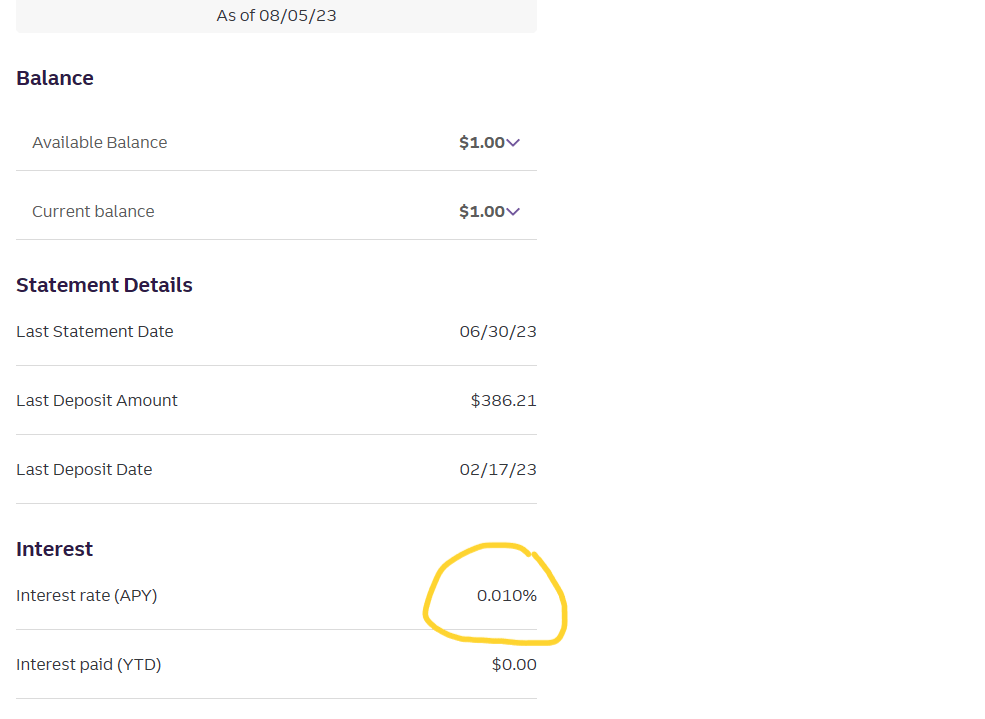 Today you are going to learn about the “8th” wonder of the world as I tackle the subject on where to put your hard earned $$$ once you start working and making real money. A lot of people I know often keep most of their money in a checking account, even a lot of the tenants I interview will do the same. Few people having savings accounts, and the ones that do, will often store their money in an associated account at the same BIG bank as their checking account. All the while earning a measly 0.010% APY. Don’t believe that they pay that low? See the embedded photo of my savings account with one of the bigger banks. (Obviously I don’t use it haha)